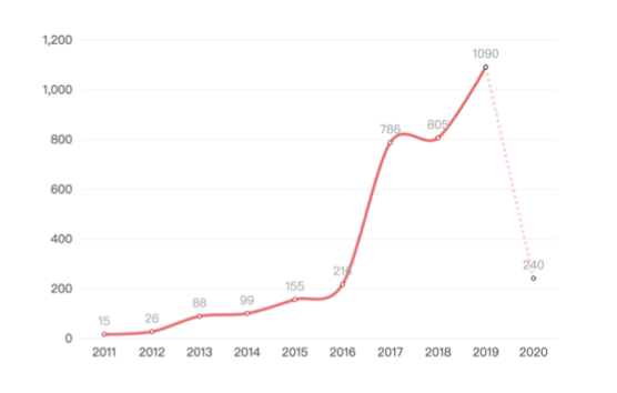 本所律師通過(guò)對(duì)alpha案例庫(kù)的檢索發(fā)現(xiàn),以股權(quán)激勵(lì)為關(guān)鍵詞檢索的案例數(shù)量按年份排列如下圖: