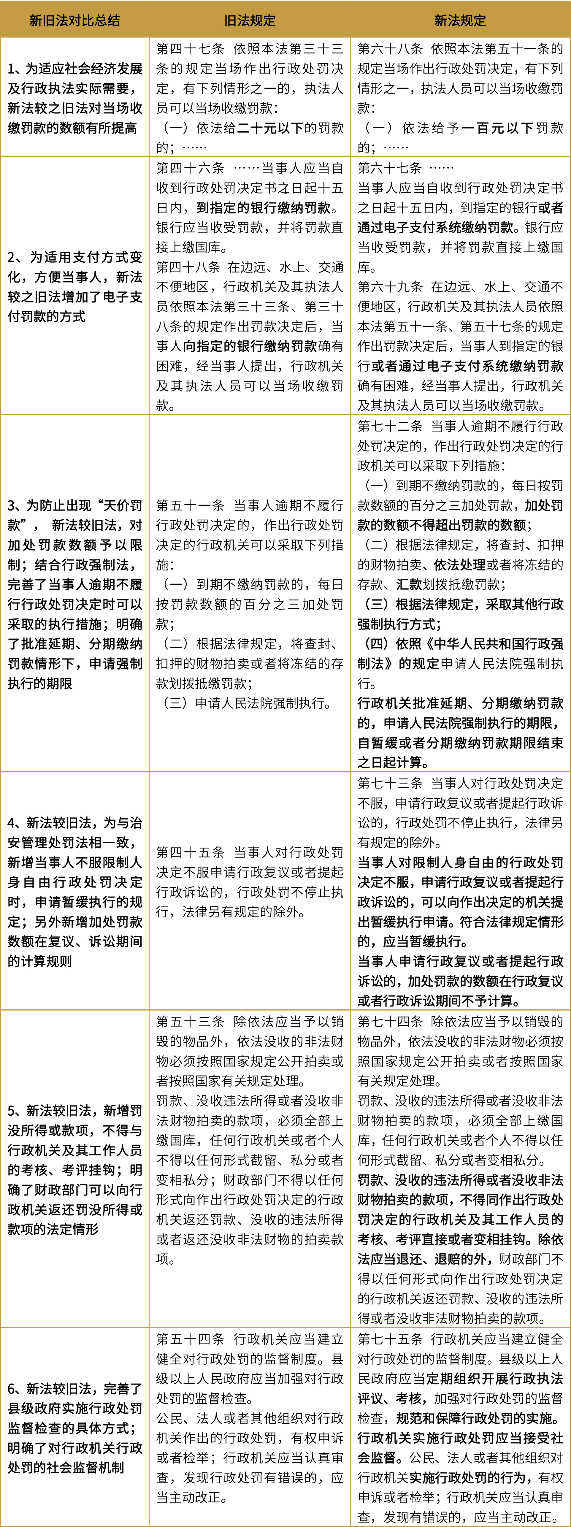 本月15日,新修訂的《中華人民共和國行政處罰法》(以下簡稱“新法”)正式實(shí)施,新法較修訂前的《中華人民共和國行政處罰法》(以下簡稱“舊法”),在“行政處罰的執(zhí)行”規(guī)定方面有所變化,新舊法重大變化對比回顧如下:
