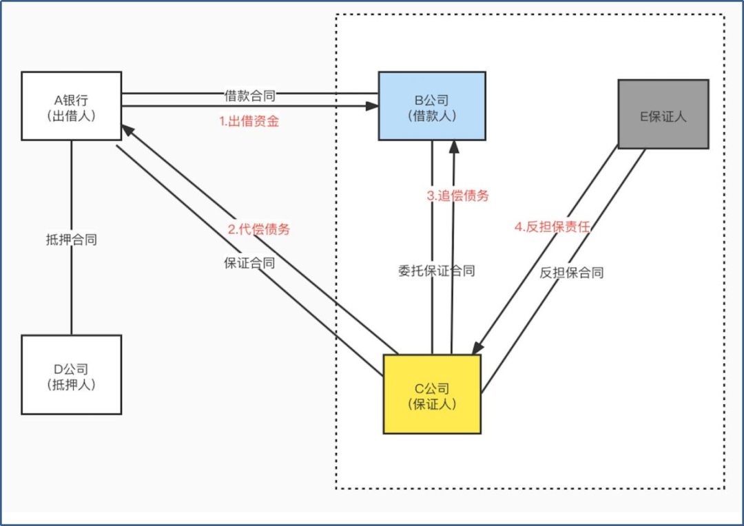 如圖一所示,A銀行與B公司簽訂了《借款合同》,C擔(dān)保公司以及D公司與A銀行簽訂《保證合同》和《抵押合同》,合同約定兩公司為本案借款提供無限責(zé)任連帶保證以及抵押擔(dān)保,同時(shí),C擔(dān)保公司與借款人B公司簽訂《委托保證合同》,B公司委托C擔(dān)保公司為上述借款提供保證擔(dān)保。且為了保證C公司代償后追償權(quán)的實(shí)現(xiàn),C公司與E保證人簽訂《反擔(dān)保合同》,約定E保證人為《委托保證合同》項(xiàng)下的債務(wù)提供連帶保證責(zé)任?,F(xiàn)借款人B公司已逾期未還款,如C擔(dān)保公司向銀行代償,現(xiàn)欲行使追償權(quán),其須同時(shí)充分具備如下要件(結(jié)合圖一案例進(jìn)行具體分析):