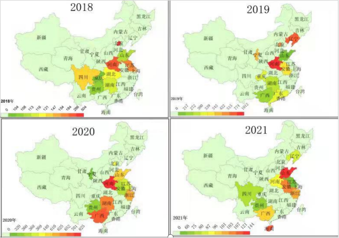 通過上述全國人口分布圖、全國GDP分布圖,以及2018至2021年期間最高院再審行政訴訟案件地域分布圖可以看出,自2018至2021年最高院再審行政訴訟案件均分布于山東、河南、江蘇、浙江、貴州、廣西等全國人口數(shù)量較多的省份或GDP較高地區(qū)。筆者認(rèn)為,最高院再審行政爭議與人口數(shù)量和經(jīng)濟(jì)發(fā)展水平密切相關(guān),經(jīng)濟(jì)和人口數(shù)量比較發(fā)達(dá)地區(qū)發(fā)生行政爭議的概率更大,最高院再審行政訴訟的案件數(shù)量也更多。
