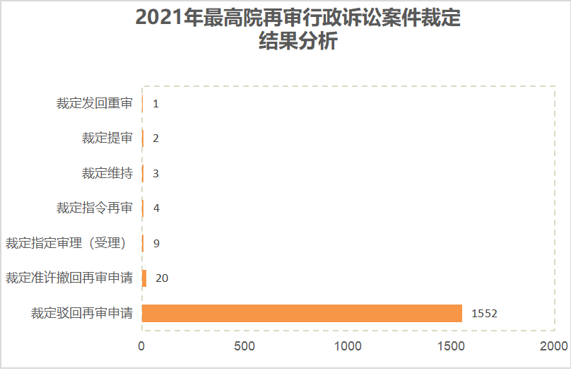 經(jīng)分析,2021年度在1685份裁判文書中,最高院再審行政訴訟案件判決書數(shù)量僅為94份,占比6%;裁定書數(shù)量高達(dá)1591份,占比94%。判決書比例較低,由此可以看出,獲得實體審理的再審行政訴訟案件比例較低,但相較于2020年判決書占比1.7%,2021年判決書比例有一定提升。
