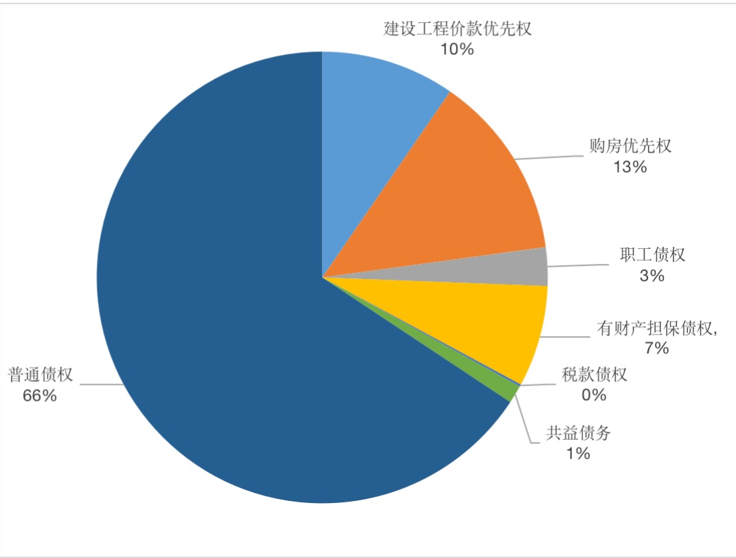 在11,368件實體權(quán)益糾紛案件中,按照破產(chǎn)法中的權(quán)益性質(zhì)即共益?zhèn)鶆?wù)、購房優(yōu)先權(quán)、建設(shè)工程價款優(yōu)先權(quán)、有財產(chǎn)擔(dān)保債權(quán)、職工債權(quán)、稅款債權(quán)、普通債權(quán)劃分,具體情況如下: