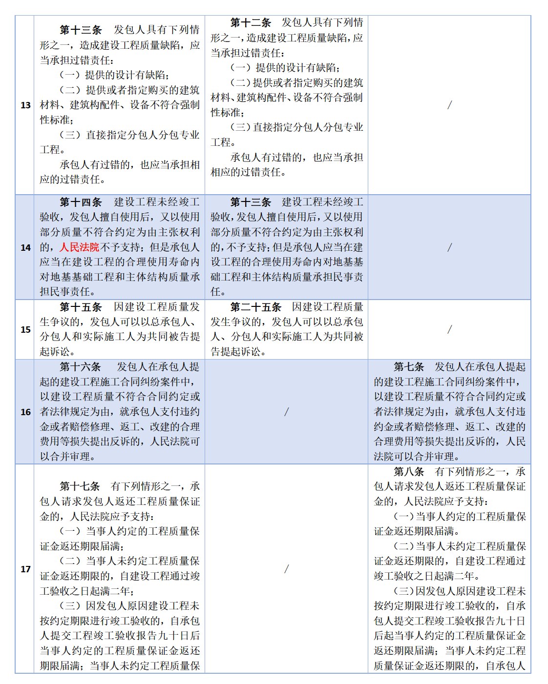 原解釋(一)規(guī)定,因承包人的過(guò)錯(cuò)造成建設(shè)工程質(zhì)量不符合約定,承包人拒絕修理、返工或者改建,發(fā)包人請(qǐng)求減少支付工程價(jià)款的,應(yīng)予支持。新解釋(一)第十二條規(guī)定,因承包人的原因造成建設(shè)工程質(zhì)量不符合約定,承包人拒絕修理、返工或者改建,發(fā)包人請(qǐng)求減少支付工程價(jià)款的,人民法院應(yīng)予支持。
