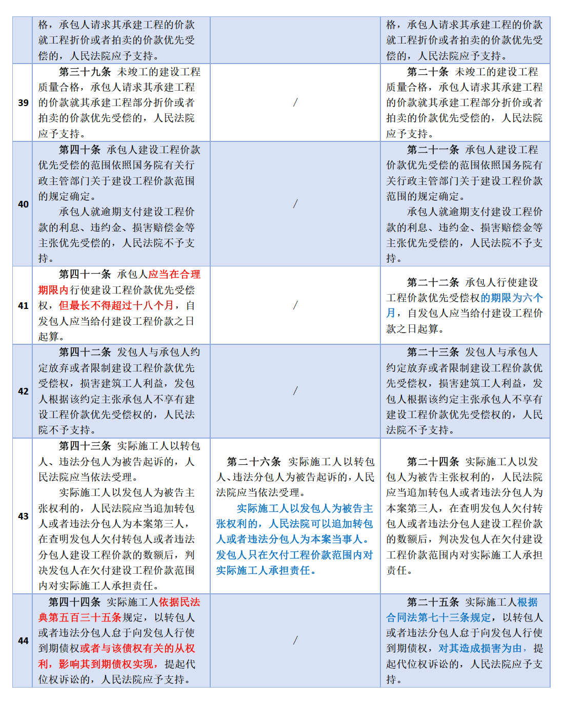 原解釋(二)規(guī)定,承包人行使建設(shè)工程價(jià)款優(yōu)先受償權(quán)的期限為六個(gè)月。新解釋(一)第四十一條規(guī)定,承包人應(yīng)當(dāng)在合理期限內(nèi)行使建設(shè)工程價(jià)款優(yōu)先受償權(quán),但最長(zhǎng)不得超過(guò)十八個(gè)月。