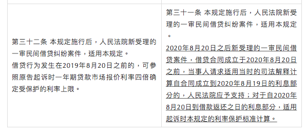 《民間借貸司法解釋第一次修訂》采用一年期貸款市場報價利率的四倍,從而取代了舊規(guī)中的“兩線三區(qū)”標準,而就目前已經(jīng)公布的一年期貸款市場報價利率的標準來看,其四倍遠遠低于舊規(guī)中年利率24%的標準。該情形導(dǎo)致實踐中就新舊規(guī)范的銜接與適用出現(xiàn)了不小的爭議。據(jù)此,《民間借貸司法解釋第二次修訂》對此進行了修改及明確。