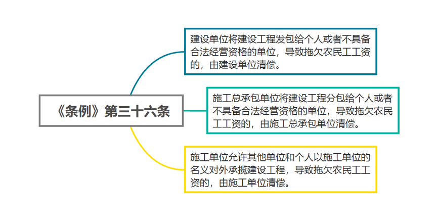 上述三種情形均是因建設(shè)單位、總承包單位或施工單位實施了違法行為導(dǎo)致發(fā)生拖欠農(nóng)民工工資,在這三種情形下,違法行為人應(yīng)當對拖欠的農(nóng)民工工資進行清償,而且建設(shè)單位、總承包單位或施工單位在承擔清償農(nóng)民工工資責任時,并不以欠付工程款為限。通過對適用《條例》第三十六條的案例分析還會發(fā)現(xiàn),案件審理主要審查是否存在違法發(fā)包、違法分包和掛靠等違法行為,以及是否出現(xiàn)了拖欠農(nóng)民工工資的事實,對于是否是違法行為導(dǎo)致了拖欠農(nóng)民工工資并不需要嚴格的舉證。