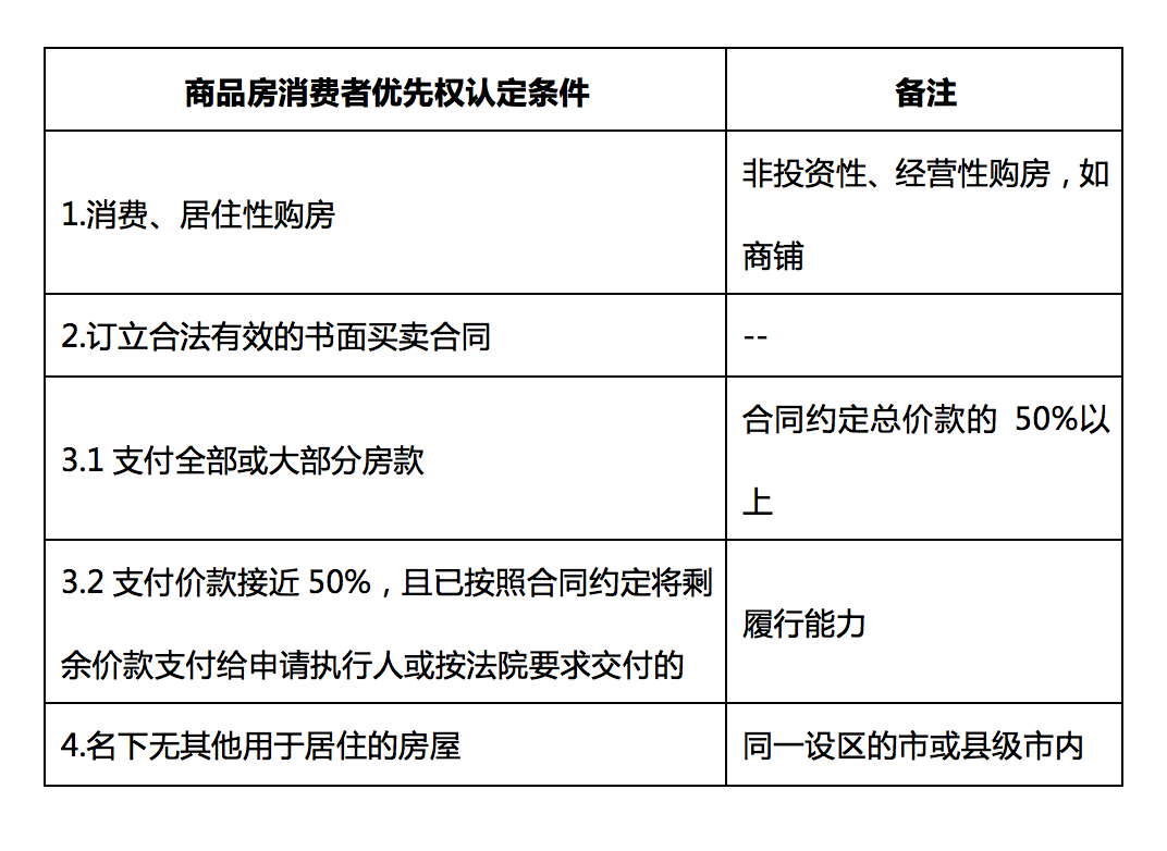 房地產(chǎn)企業(yè)破產(chǎn)過(guò)程中還存在各類“消費(fèi)者”,如以房抵債、合作建房、一房二賣(mài)、商鋪消費(fèi)者等,該類主體性質(zhì)的判斷應(yīng)當(dāng)在結(jié)合事實(shí)情況,綜合判斷實(shí)體法律關(guān)系、程序瑕疵及善意取得等方面的基礎(chǔ)上,遵循以上消費(fèi)者的認(rèn)定條件予以確定,本文不再展開(kāi)論述。