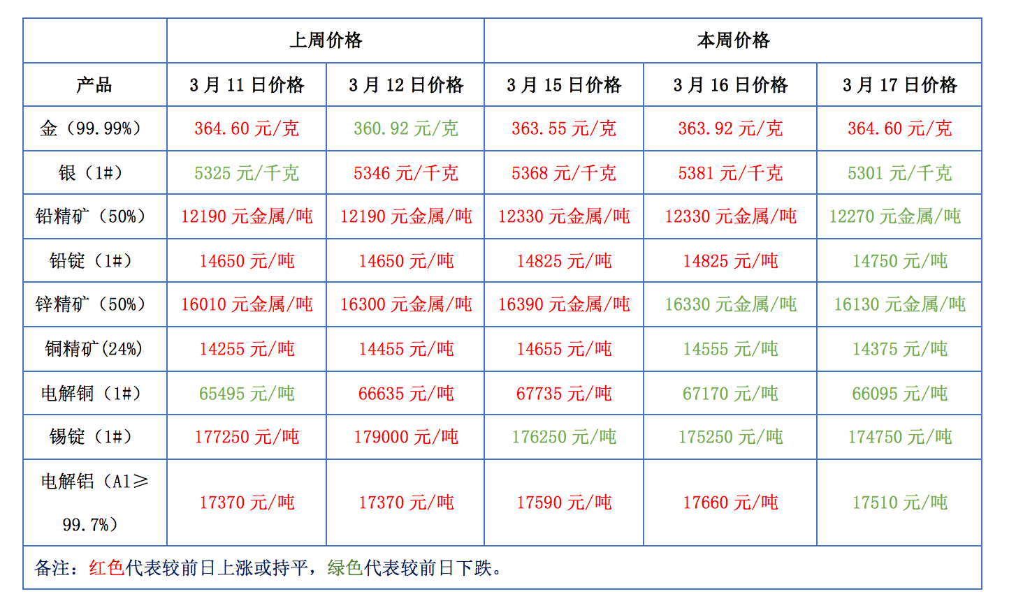 下表為本周金、銀、鉛、鋅、銅、鋁等主要有色金屬礦產(chǎn)品價格變動情況:
