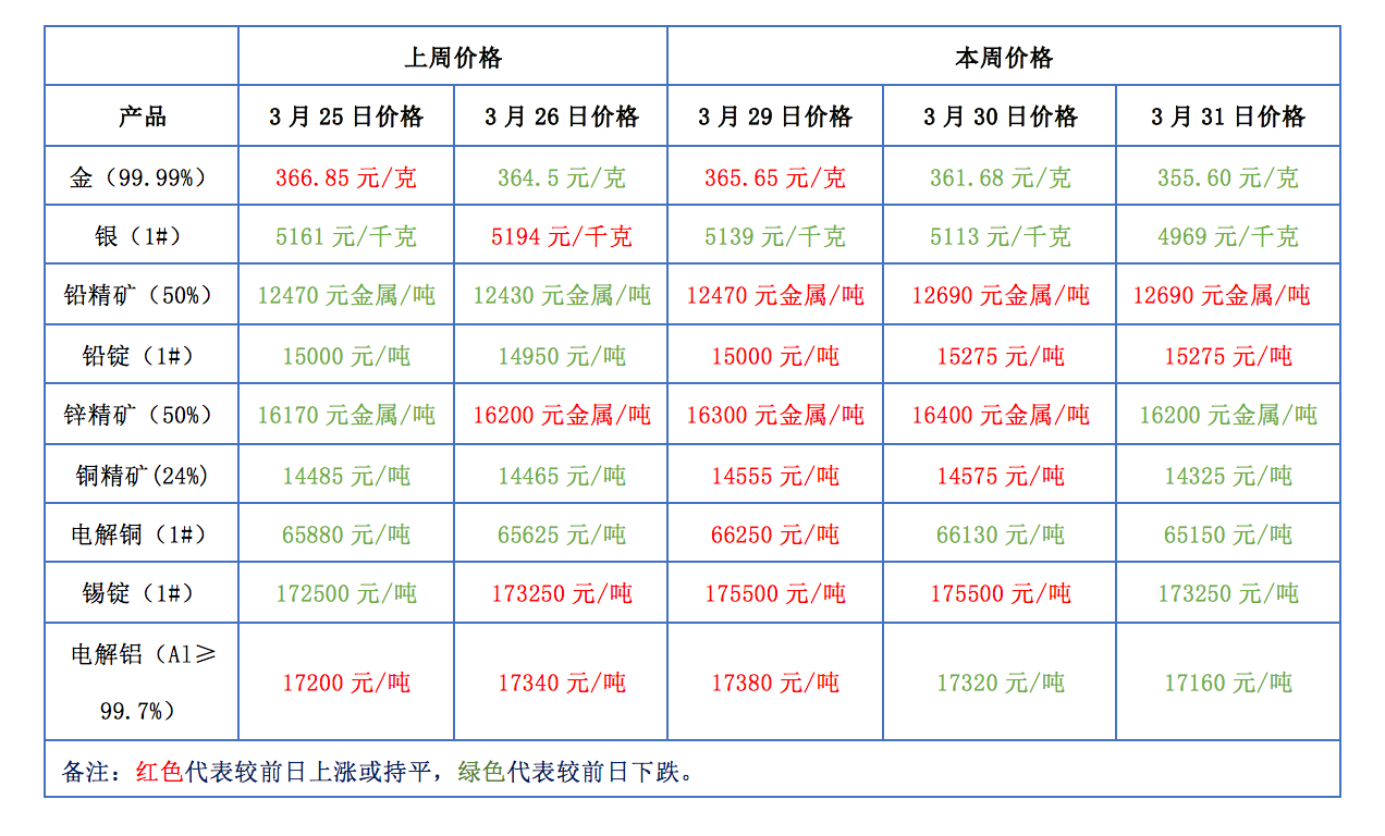 下表為本周金、銀、鉛、鋅、銅、鋁等主要有色金屬礦產(chǎn)品價(jià)格變動(dòng)情況: