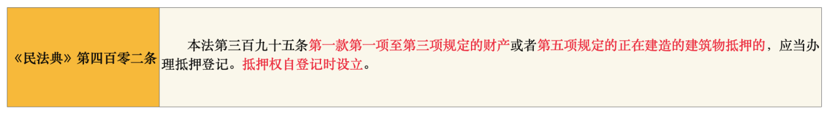 ②《民法典》第402條中的第一項至第三項規(guī)定的財產(chǎn)為“以建筑物和其他土地附著物、建設(shè)用地使用權(quán)、海域使用權(quán)、”第五項為“正在建造的建筑物”。以前述幾項財產(chǎn)進行抵押的,抵押權(quán)自登記時設(shè)立。那么為什么上述財產(chǎn)的抵押,抵押權(quán)要自登記時設(shè)立呢?究其原因,在于上述財產(chǎn)有其獨特性,而明晰上述抵押財產(chǎn)的權(quán)屬關(guān)系,對于債權(quán)人是否決定接受該財產(chǎn)作為抵押物具有重要影響,同時也利于經(jīng)濟交易活動的穩(wěn)定。