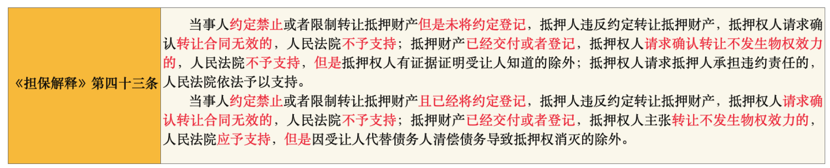 《民法典》第406條顛覆了《物權(quán)法》第191條關(guān)于未經(jīng)抵押權(quán)人同意,禁止轉(zhuǎn)讓的強制性規(guī)則,規(guī)定了抵押財產(chǎn)轉(zhuǎn)讓制度,即除非當事人另有約定,否則抵押財產(chǎn)可以轉(zhuǎn)讓,抵押權(quán)不受影響。而《擔保解釋》第43條則是對《民法典》第406條的補充。具體來說,如果《抵押合同》明確約定禁止或限制轉(zhuǎn)讓抵押財產(chǎn)的,抵押人又將該抵押財產(chǎn)轉(zhuǎn)讓的,不影響轉(zhuǎn)讓合同效力。至于抵押財產(chǎn)是否發(fā)生物權(quán)變動,應(yīng)根據(jù)是否將該禁止或限制轉(zhuǎn)讓約定進行登記來進行區(qū)分。具體如下圖: