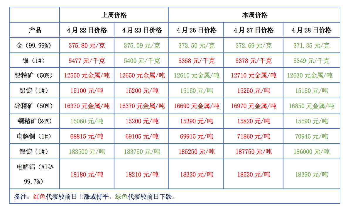下表為本周金、銀、鉛、鋅、銅、鋁等主要有色金屬礦產(chǎn)品價(jià)格變動(dòng)情況:
