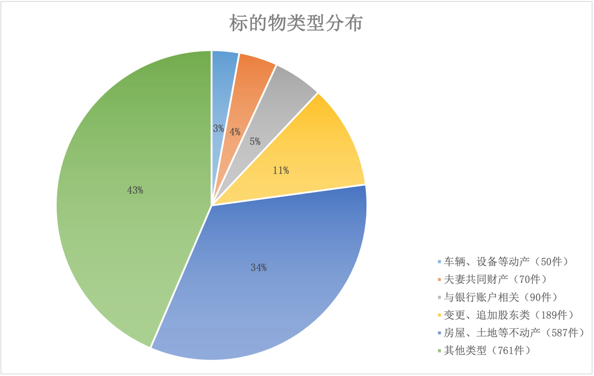 從標的物類型分布情況來看,執(zhí)行異議之訴爭議的標的物類型主要為:(1)房屋、土地等不動產(chǎn);(2)變更、追加股東;(3)銀行賬戶相關(guān);(4)夫妻共同財產(chǎn);(4)車輛、設備等較高價值的動產(chǎn)。