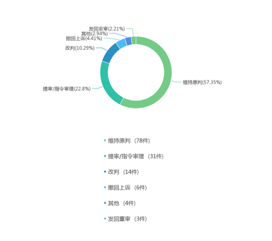 從再審裁判結(jié)果可以看到,維持原判的有78件,占比為57.35%;提審/指令審理的有31件,占比為22.79%;改判的有14件,占比為10.29%。