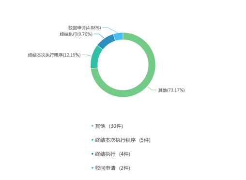 從執(zhí)行裁判結(jié)果可以看到,其他的有30件,占比為73.17%;終結(jié)本次執(zhí)行程序的有5件,占比為12.20%;終結(jié)執(zhí)行的有4件,占比為9.76%。