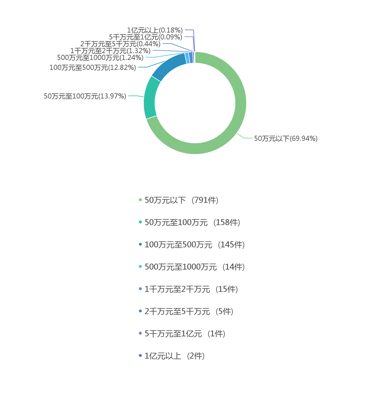 從標的額可以看到,標的額為50萬元以下的案件數(shù)量最多,有791件,50萬元至100萬元的案件有158件,100萬元至500萬元的案件有145件,1千萬元至2千萬元的案件有15件,500萬元至1000萬元的案件有14件。