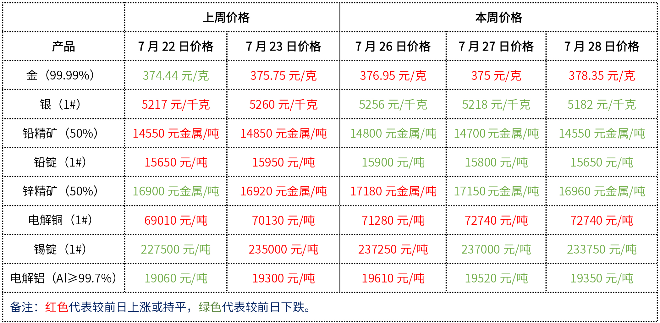 金、銀、鉛、鋅、銅、鋁等主要金屬本周報價。