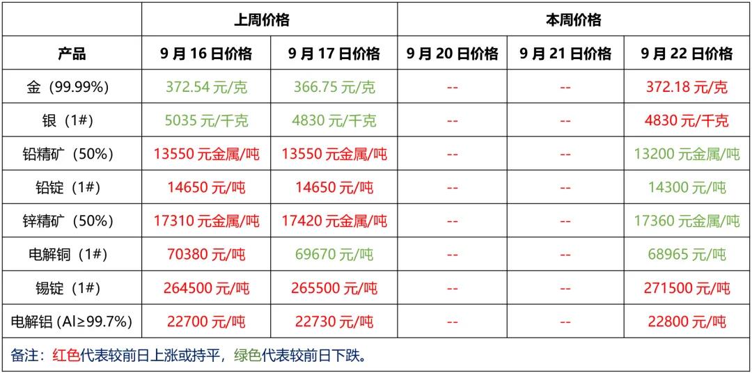 金、銀、鉛、鋅、銅、鋁等主要金屬本周報(bào)價(jià)