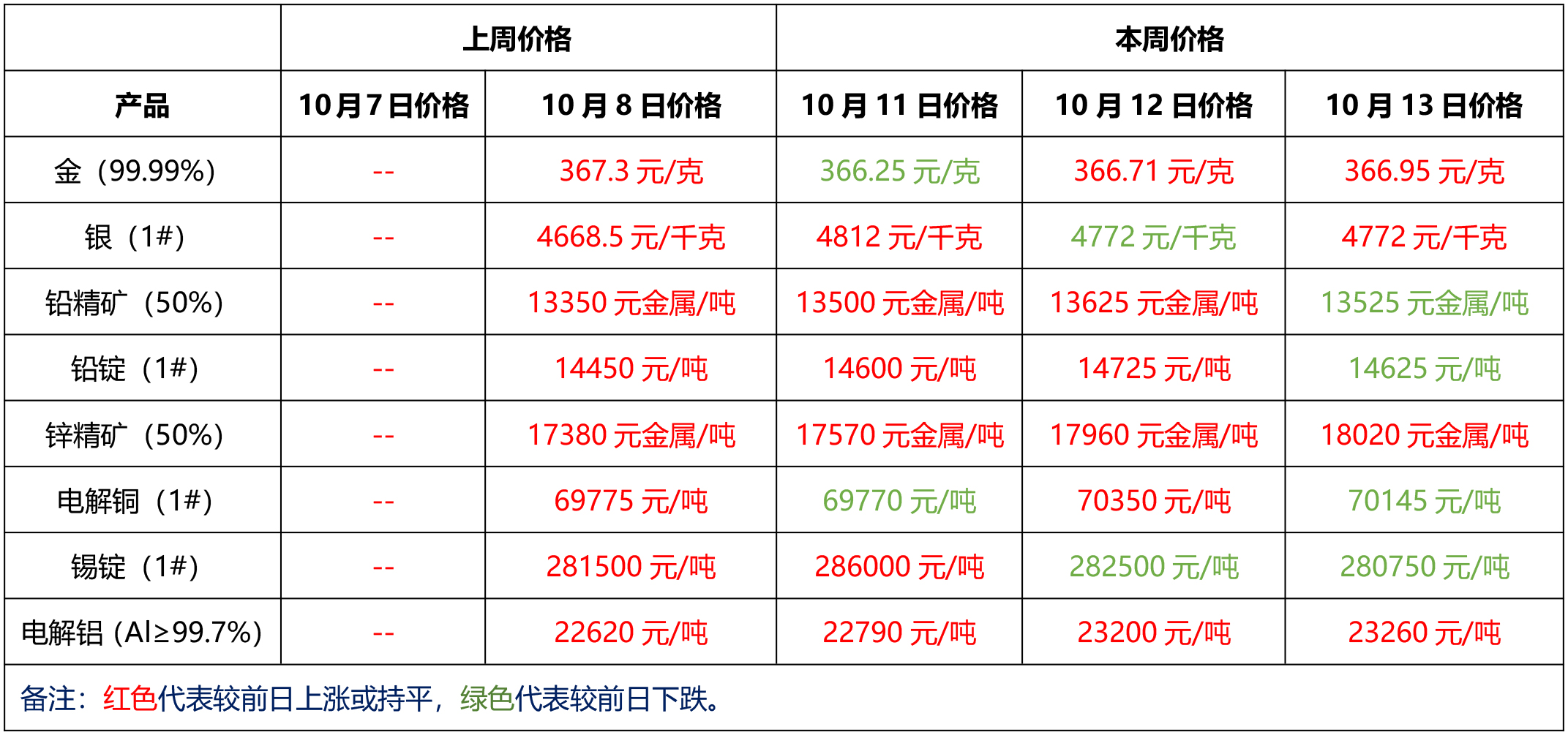 金、銀、鉛、鋅、銅、鋁等主要金屬本周報價