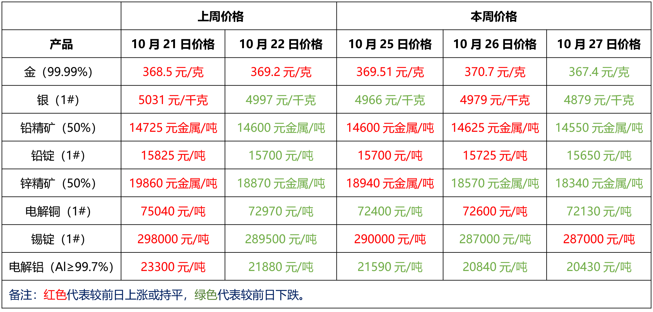 金、銀、鉛、鋅、銅、鋁等主要金屬本周報價