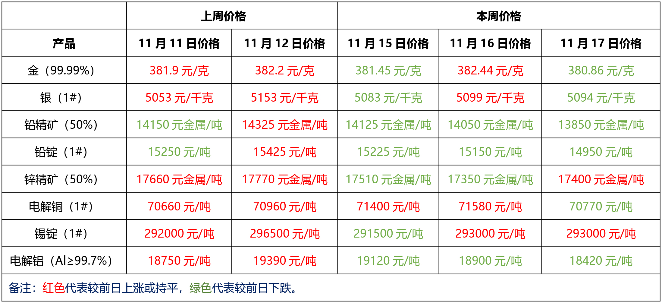 金、銀、鉛、鋅、銅、鋁等主要金屬本周報價