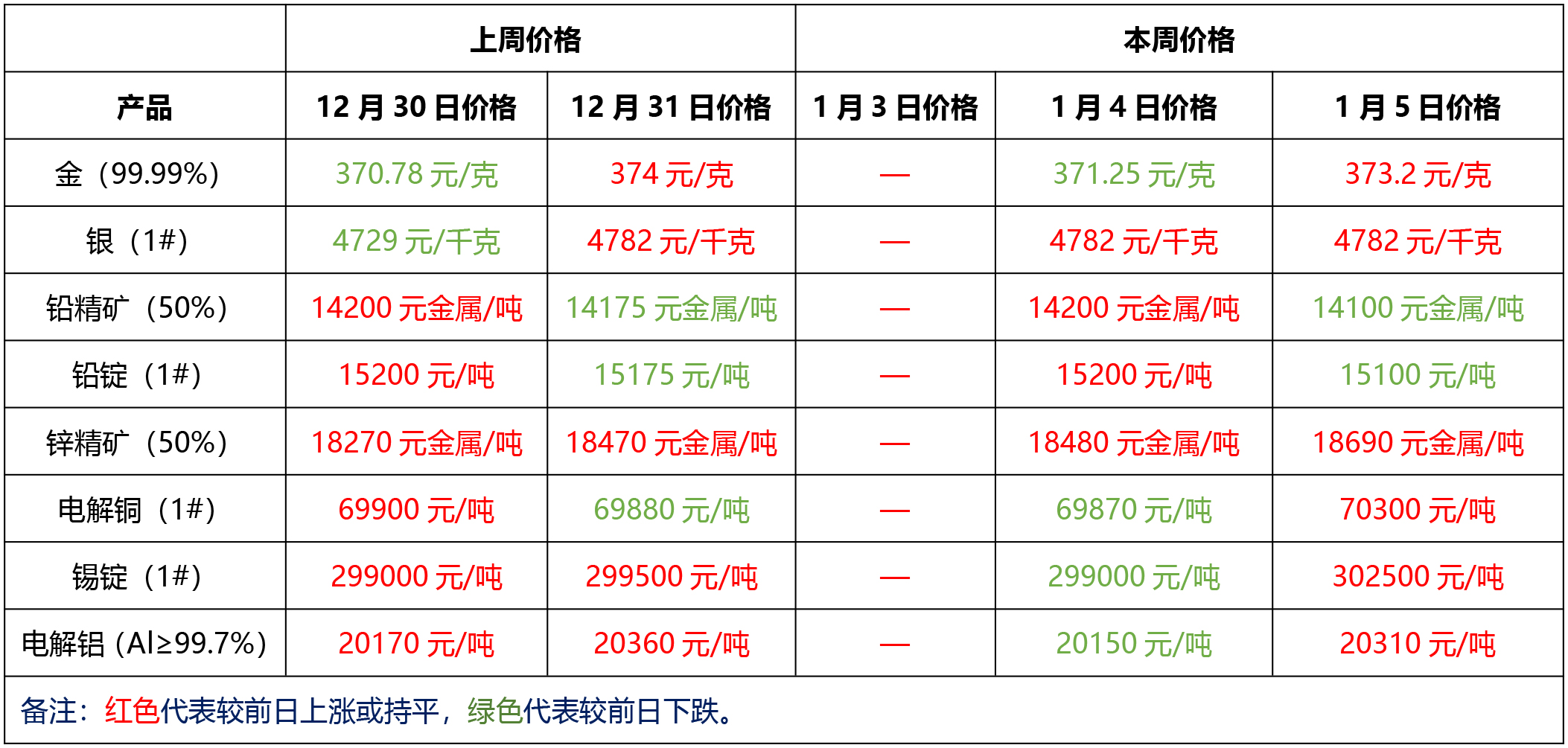 金、銀、鉛、鋅、銅、鋁等主要金屬本周報價