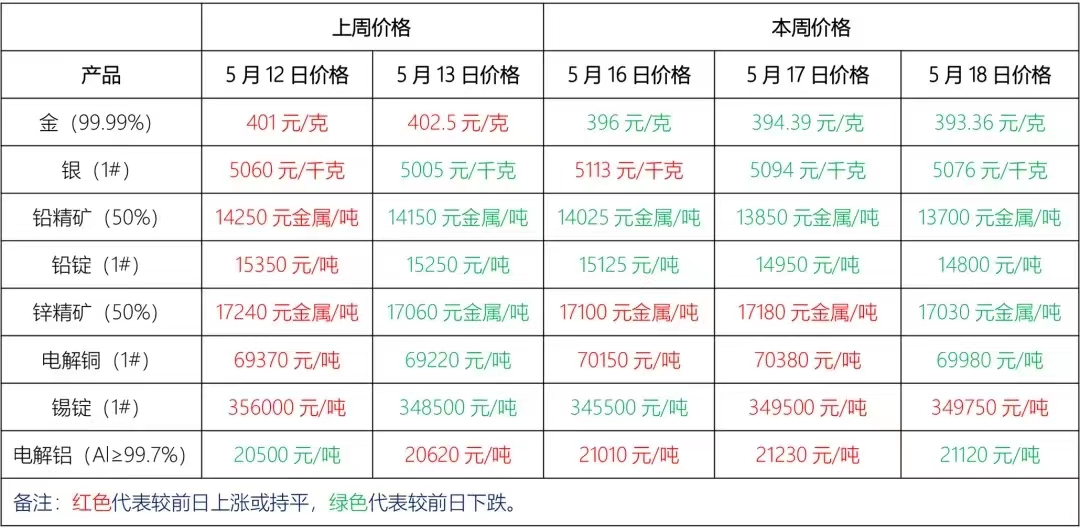 金、銀、鉛、鋅、銅、鋁等主要金屬本周報價
