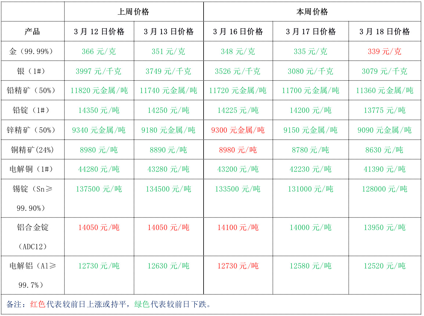 下表為本周金、銀、鉛、鋅、銅、鋁等主要有色金屬礦產(chǎn)品價(jià)格變動(dòng)情況: