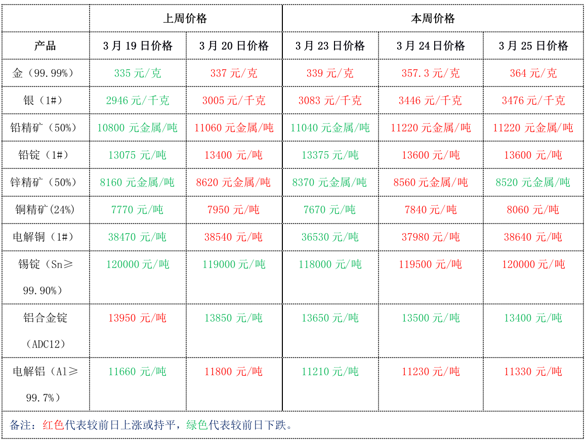 下表為本周金、銀、鉛、鋅、銅、鋁等主要有色金屬礦產(chǎn)品價(jià)格變動(dòng)情況: