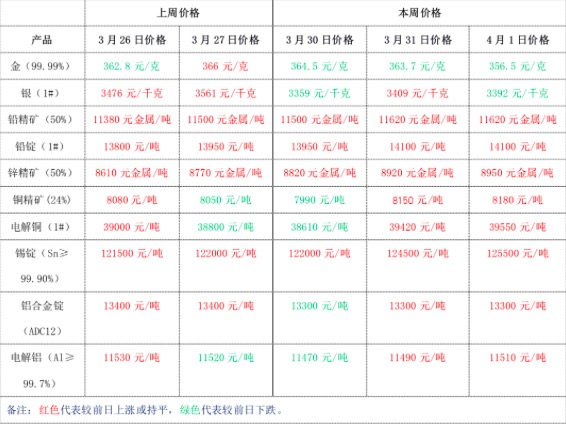 下表為本周金、銀、鉛、鋅、銅、鋁等主要有色金屬礦產(chǎn)品價(jià)格變動(dòng)情況: