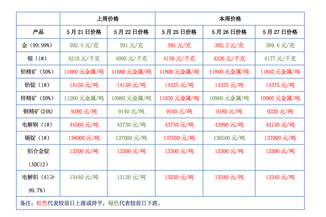 下表為本周金、銀、鉛、鋅、銅、鋁等主要有色金屬礦產(chǎn)品價(jià)格變動(dòng)情況: