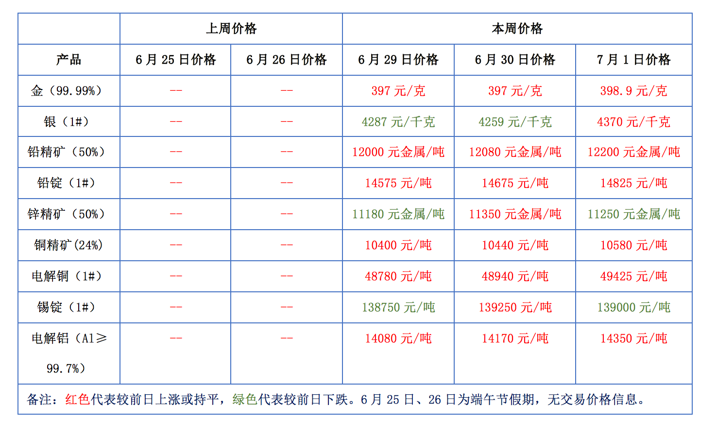下表為本周金、銀、鉛、鋅、銅、鋁等主要有色金屬礦產(chǎn)品價(jià)格變動(dòng)情況:
