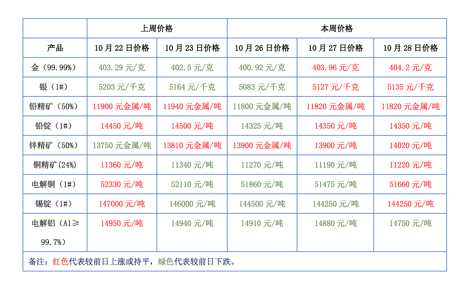 下表為本周金、銀、鉛、鋅、銅、鋁等主要有色金屬礦產品價格變動情況: