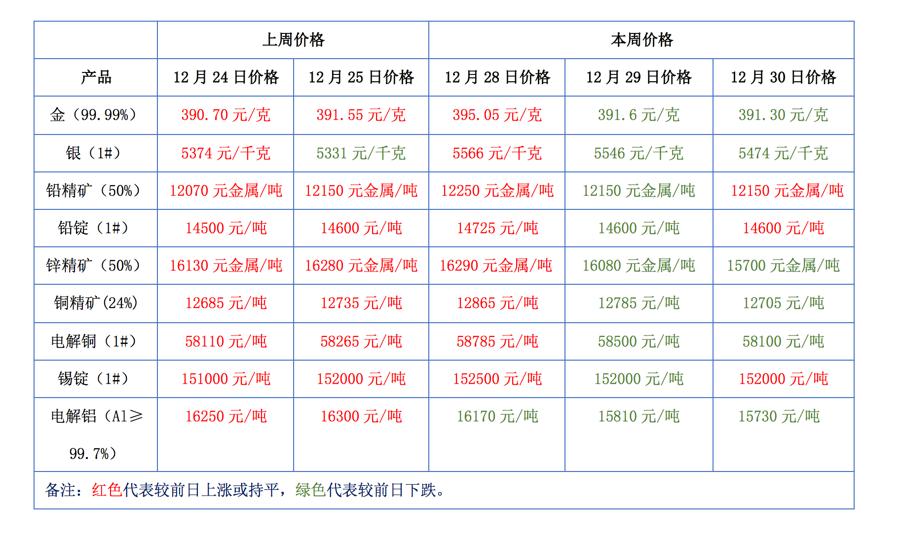 下表為本周金、銀、鉛、鋅、銅、鋁等主要有色金屬礦產(chǎn)品價(jià)格變動情況: