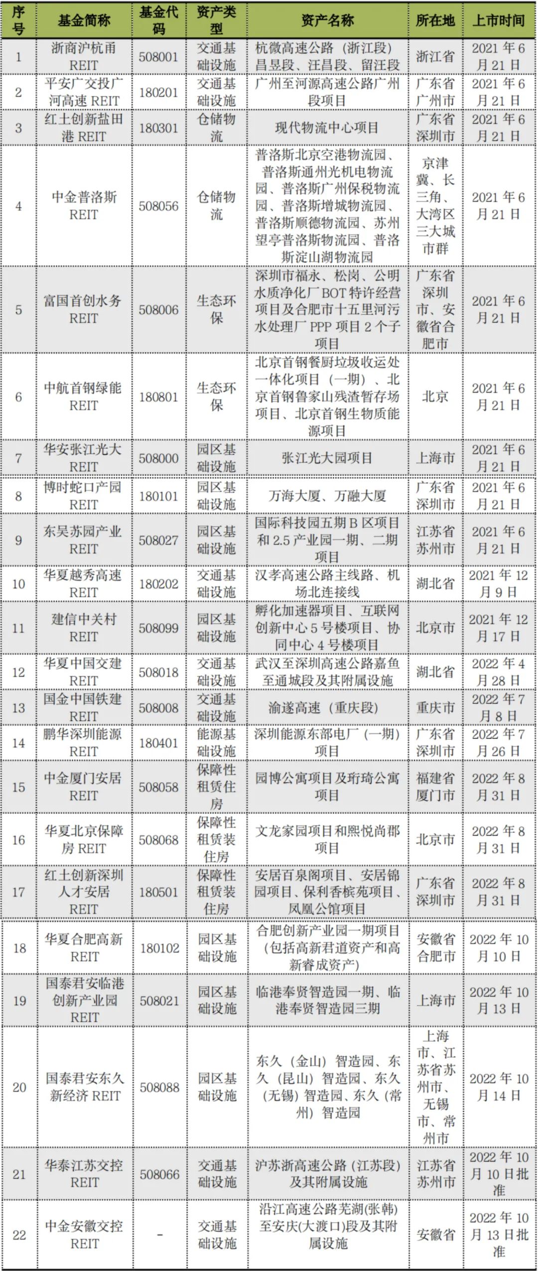 截至2022年10月18日,市場上成功發(fā)售的基礎(chǔ)設(shè)施公募REITs已經(jīng)增至22只,已上市公募REITs的底層項目涵蓋產(chǎn)業(yè)園區(qū)、倉儲物流、高速公路、環(huán)保水務、清潔能源、保障性租賃住房等六大行業(yè)類型。具體情況如下: