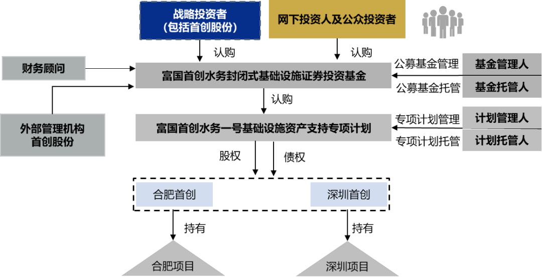 以富國首創(chuàng)水務REIT為例,經(jīng)檢索巨潮咨詢網(wǎng)(http://www.cninfo.com.cn/),富國首創(chuàng)水務REIT的交易結(jié)構(gòu)如下: