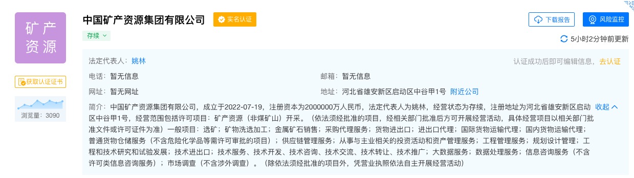 中國(guó)礦產(chǎn)資源集團(tuán)有限公司于今日(7月19日)成立,注冊(cè)資本為200億人民幣,法定代表人姚林。注冊(cè)地為雄安新區(qū);經(jīng)營(yíng)范圍主要為礦產(chǎn)資源(非煤礦山)開(kāi)采。