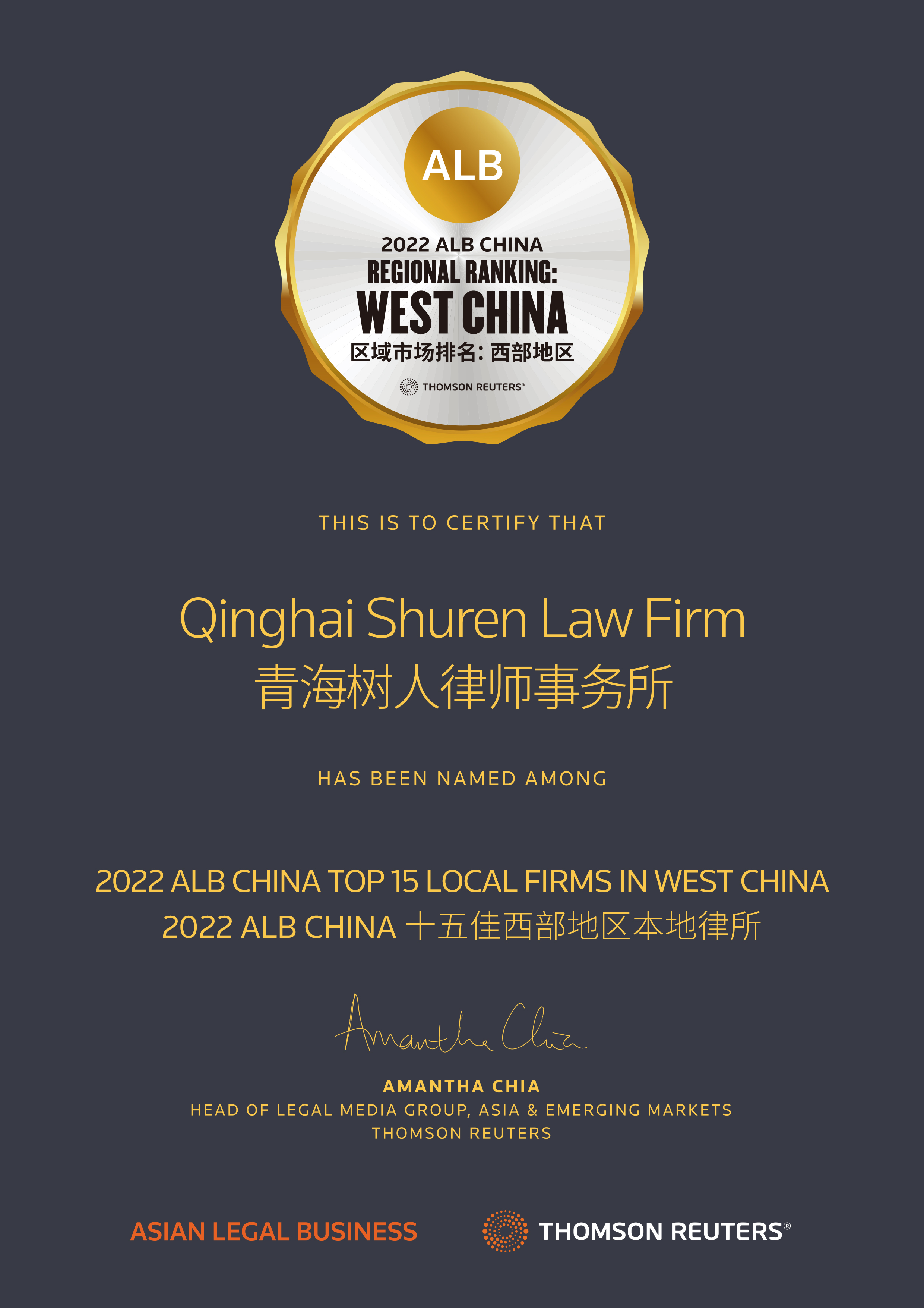 2022年7月21日,湯森路透ALB發(fā)布2022 ALB China 區(qū)域市場排名(西部地區(qū)),樹人律師事務(wù)所榮登榜單,亦是青海唯一一家上榜的律所。