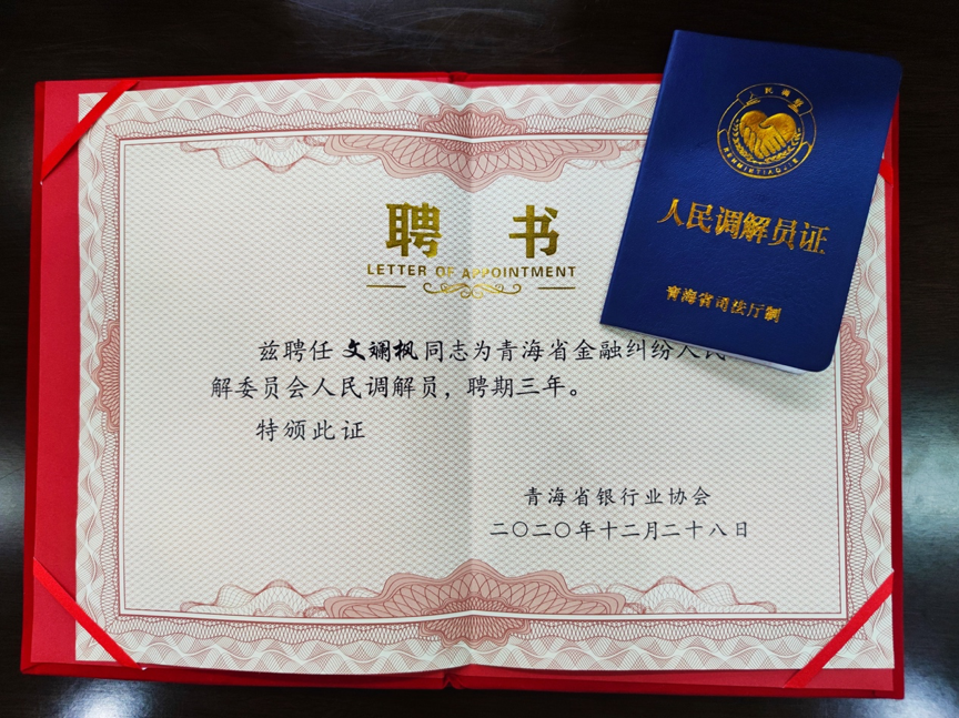 我所蔡賢龍、文斕楓律師被聘任為青海省金融糾紛人民調(diào)解委員會調(diào)解員